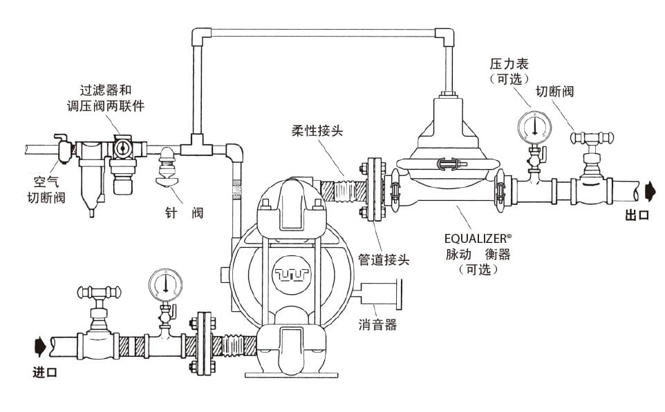 將泵安裝在平整臺面上,底腳固定,接上物料進出管道(物料進出口處的建議:安裝30-50CM長彈性軟管(或撓性接頭)以保護泵,降低、減少震動,避免螺栓松動,造成滲漏),緊固隔膜泵上所有螺絲(防止運輸搬動途中造成螺栓松動),接上氣源即可。